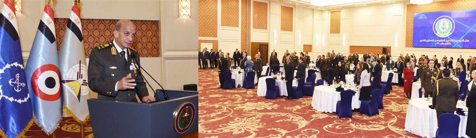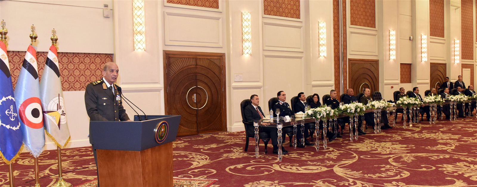 كما ألقى اللواء أح محرز عبد الوهاب القائم بأعمال رئيس هيئة الإستخبارات العسكرية كلمة قدم خلالها الشكر والتقدير للقيادة العامة للقوات المسلحة لما قدمته من كافة أوجه الدعم للإرتقاء بمستوى عناصر التمثيل الدبلوماسى العسكرى المصرى بالخارج ، مشيراً إلى الجهد المبذول لإعدادهم وتأهيلهم ليكونوا قادرين على آداء المهام المكلفين بها على أكمل وجه.