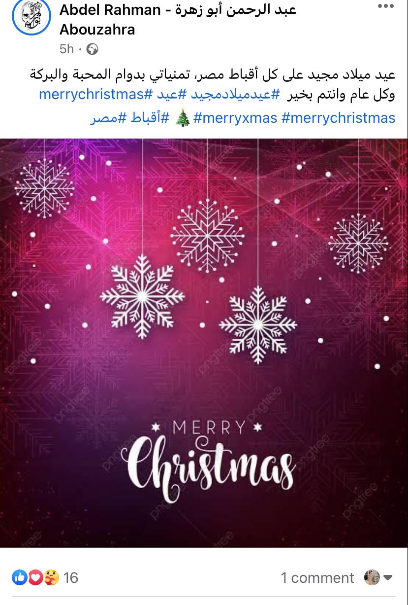 وكتبت عبد الرحمن أبو زهرة :"عيد ميلاد مجيد على كل أقباط مصر، تمنياتي بدوام المحبة والبركة وكل عام وانتم بخير عيد ميلاد مجيد".