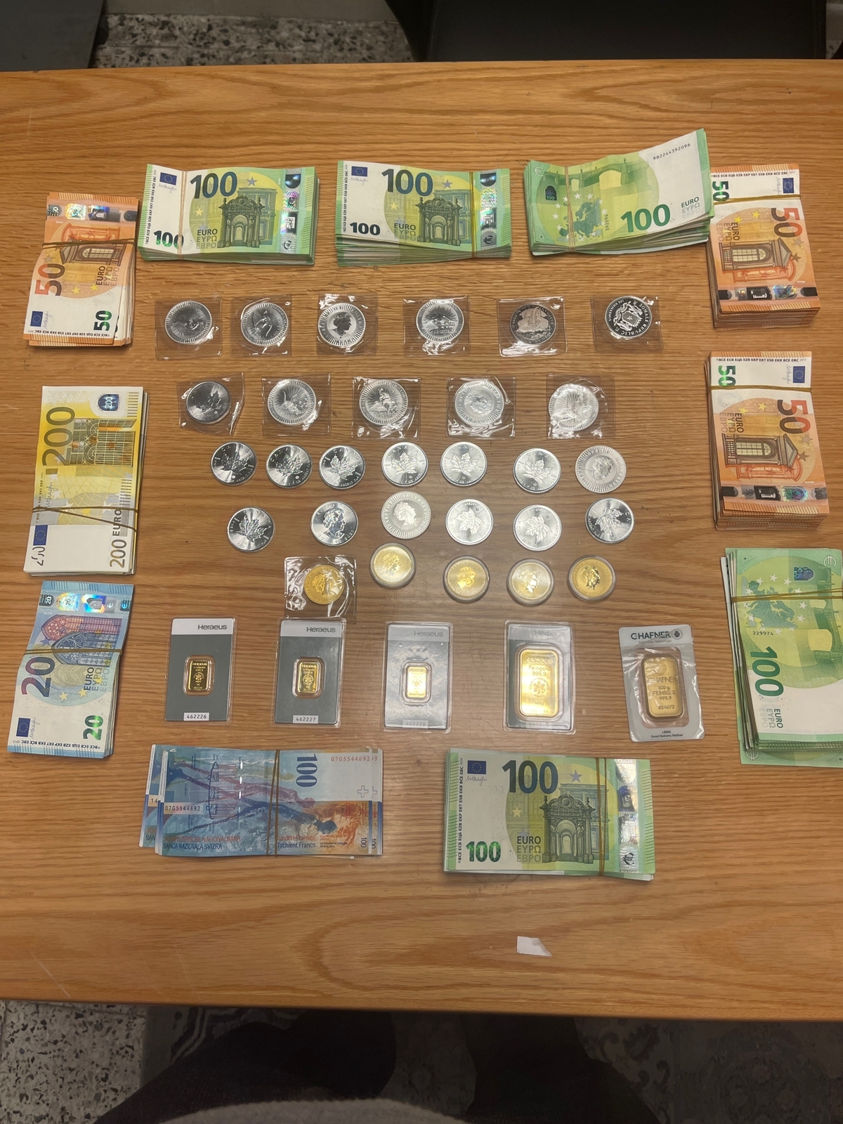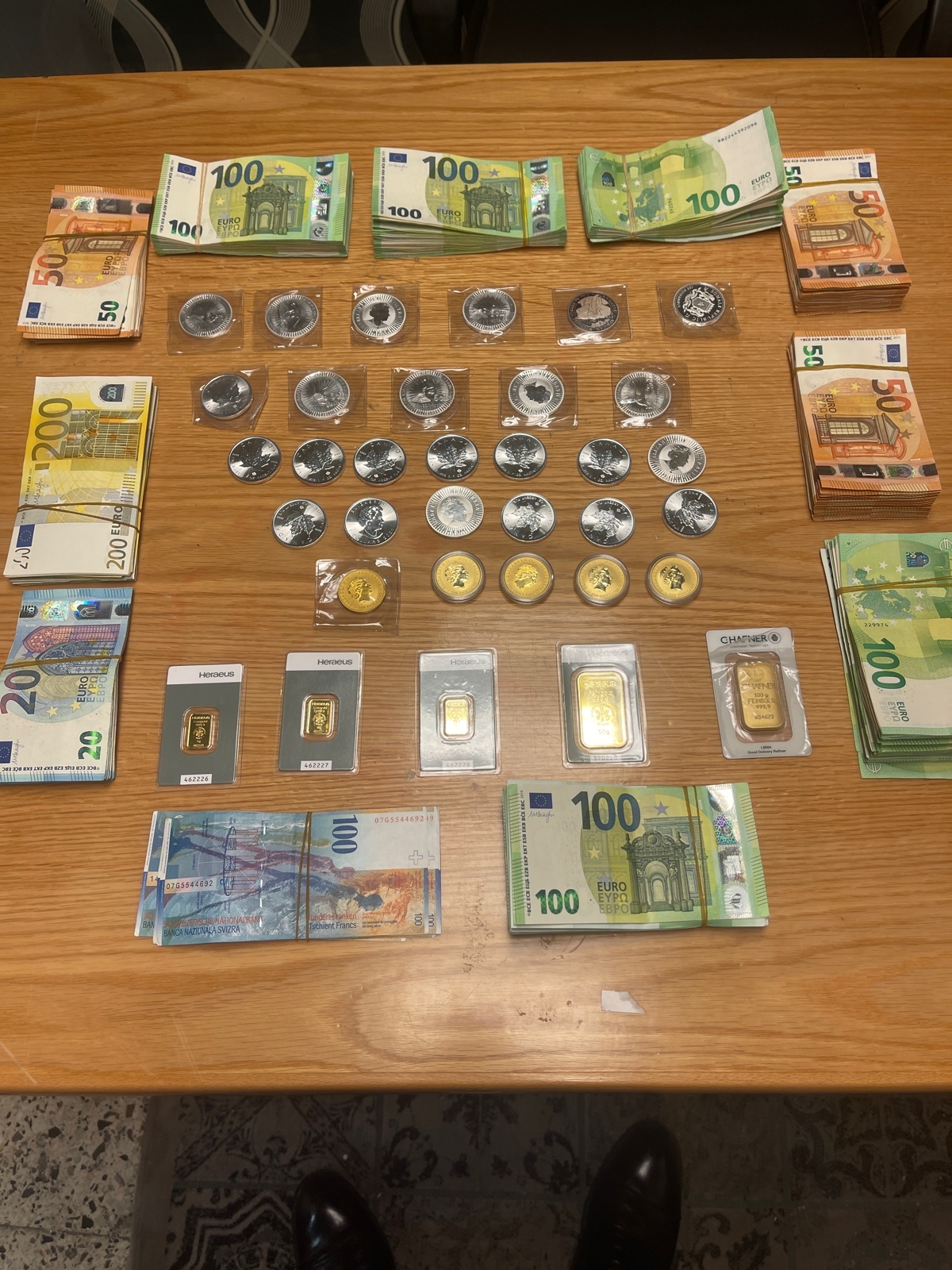 وقام مهند سامى المشرف على صاله السفر بتكليف محمد أبو بكر رسلان مأمور الجمرك المعين بصاله السفر بتفتيش حقائب فتبين وجود 86 ألف يورو و1400 فرنك سويسري و 5 جنيهات ذهبية و 5 سبائك من الذهب و 24 جنيه فضى .