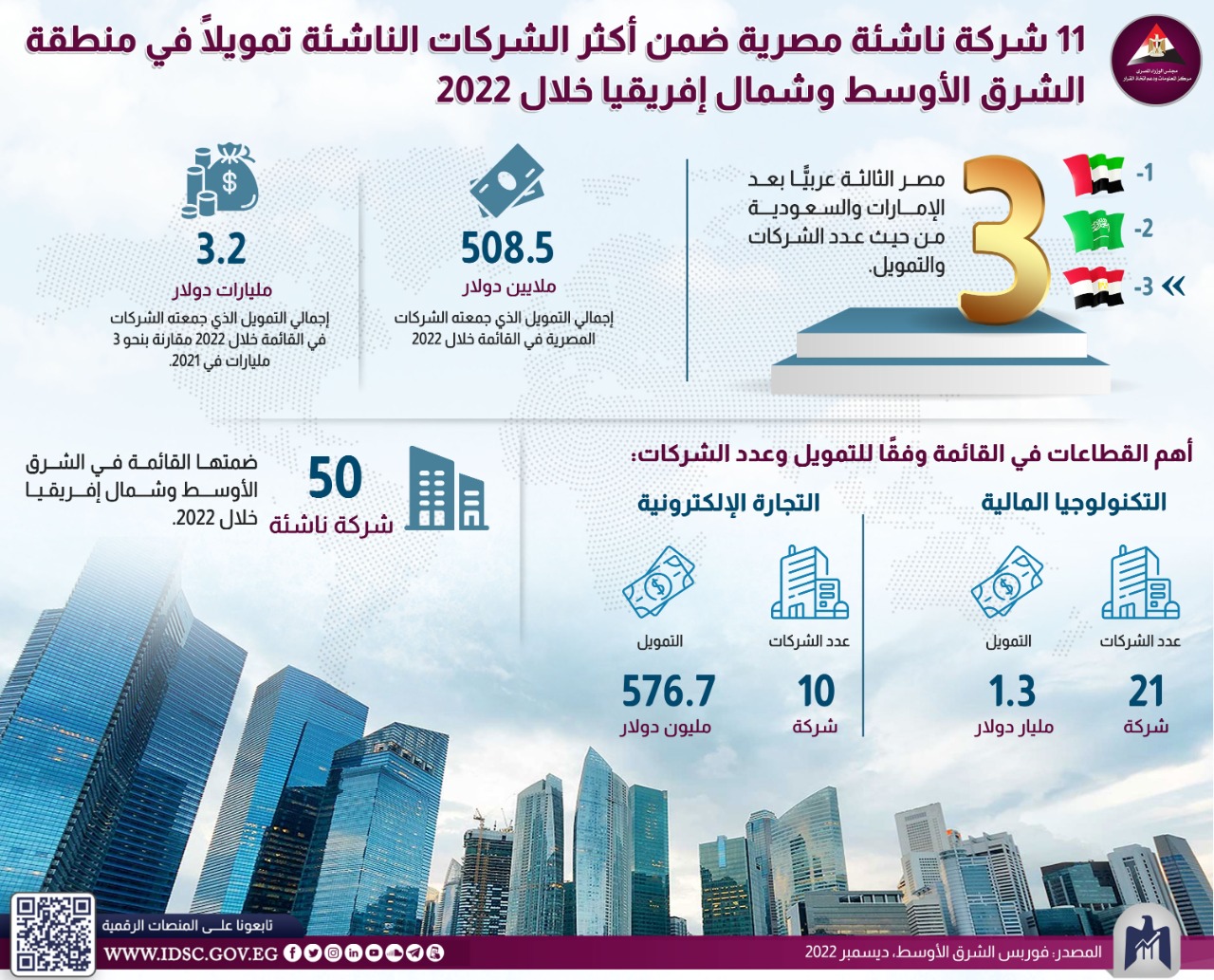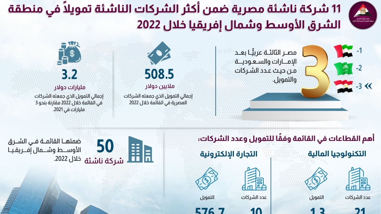 وتضم القائمة 50 شركة ناشئة في منطقة الشرق الأوسط وشمال إفريقيا استطاعت جمع 3.2 مليارات دولار خلال 2022 مقارنة بنحو 3 مليارات في 2021، وقد جاءت مصر في المرتبة الثالثة عربيًّا بعد الإمارات والسعودية من حيث عدد الشركات والتمويل.