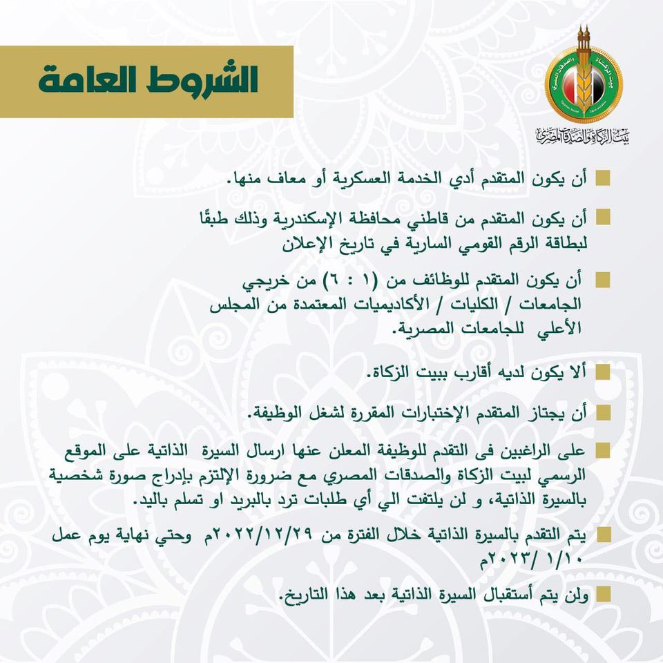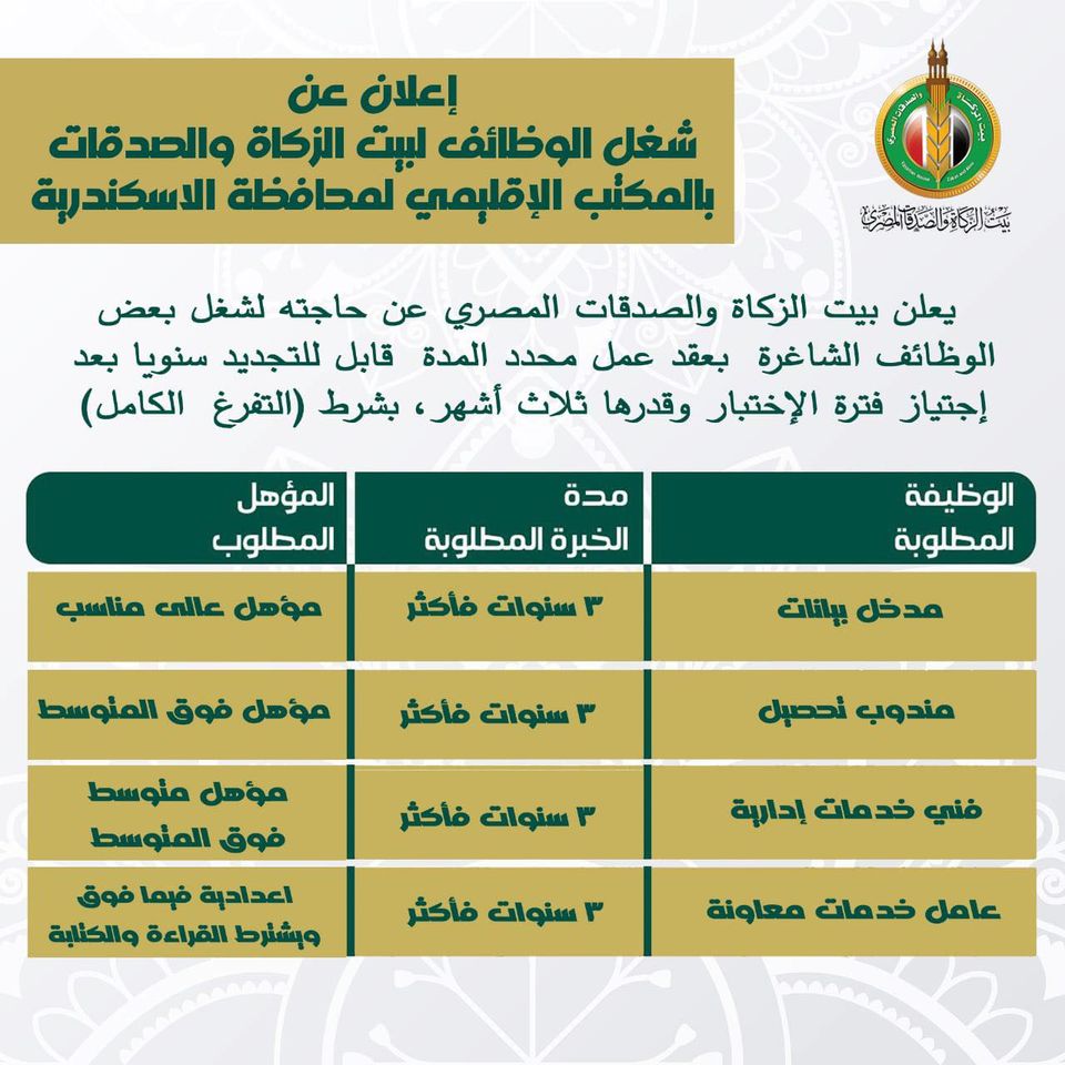 أعلن بيت الزكاة والصدقات المصري عن حاجته لشغل بعض الوظائف الشاغرة بعقد عمل محدد المدة قابل للتجديد سنويا بعد اجتياز فترة الاختبار وقدرها ثلاث أشهر، بشرط (التفرغ الكامل)