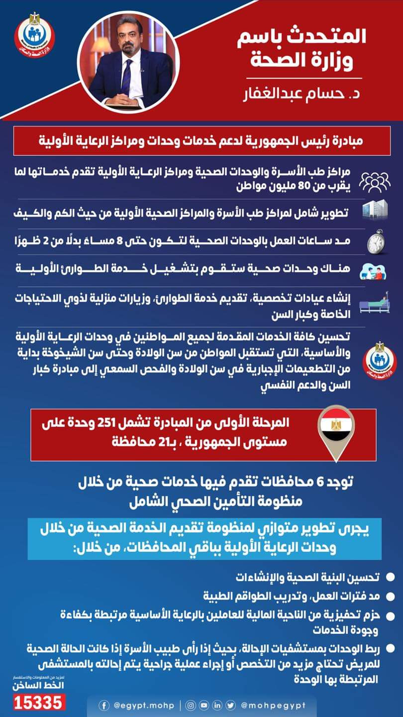 نشر الدكتور حسام عبدالغفار، المتحدث باسم وزارة الصحة والسكان، مجموعة من المعلومات الهامة عن مبادرة رئيس الجمهورية لدعم خدمات وحدات ومراكز الرعاية الأولية.