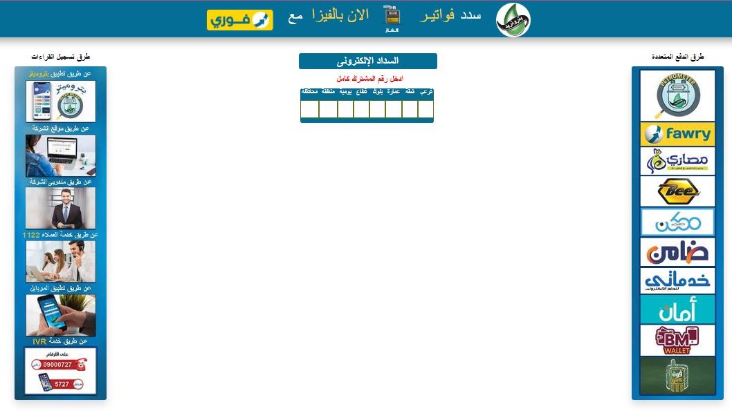 إبلاغ القراءة والسداد من خلال ماكينات الصرف الألى لبنك مصر وبنك بلوم وبنك الأهلي المتحد.