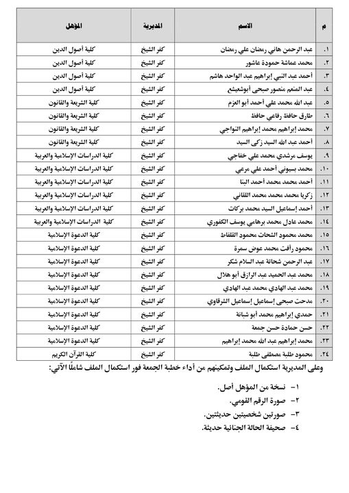 أعلنت وزارة الأوقاف اعتماد 24 خطيبًا جديدًا بالمكافأة على بند التحسين من محافظة (كفر الشيخ) المتقدمين للخطابة بالمكافأة على بند التحسين من خريجي جامعة الأزهر دفعة مايو 2022.