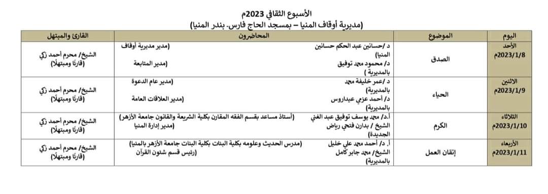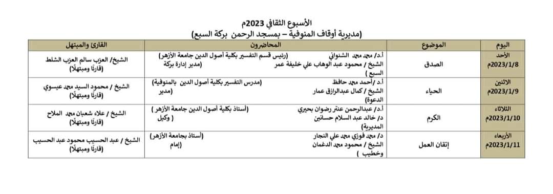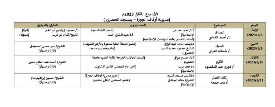 ويُقام الأسبوع الثقافي في 12 محافظة في وقت واحد وهي: (الجيزة، القليوبية ،البحيرة، المنوفية، الدقهلية، سوهاج، المنيا، أسوان، بور سعيد، مطروح، البحر الأحمر، شمال سيناء)، وذلك خلال الأسبوع القادم من الأحد 8/ 1/ 2023م حتى الأربعاء 11/ 1/ 2023م ، علمًا بأن محاضرات الأسبوع الثقافي تُعقد بعد صلاة العشاء مباشرة ، بمشاركة نخبة من كبار العلماء والأئمة المتميزين مع نخبة من كبار القراء والمبتهلين، وذلك على النحو التالي :