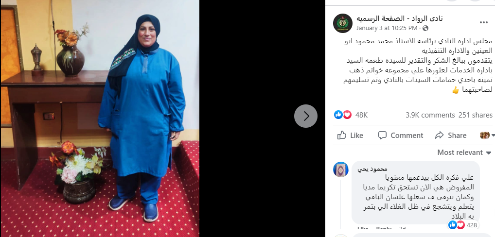 تصدرت قصة "طعمة السيد" عاملة النظافة بنادي العاشر من رمضان، مواقع التواصل الإجتماعي، بعدما عثرت على مجموعة خوات ذهب ثمينة داخل حمام السيدات بالنادي.