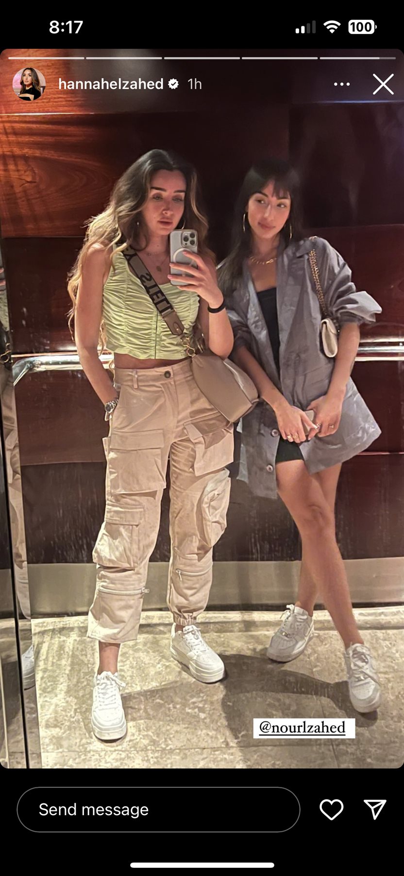 وتألقت هنا باطلالة صيفية كاجوال، وظهرت رفقة شقيقتها نور داخل الاسانسير.