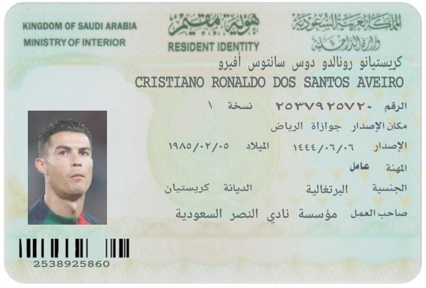 بالإضافة إلى أن صورة رونالدو في الهوية بقميص البرتغال وليست صورة رسمية، والمهنة الحقيقية لاعب كرة وليس عامل.