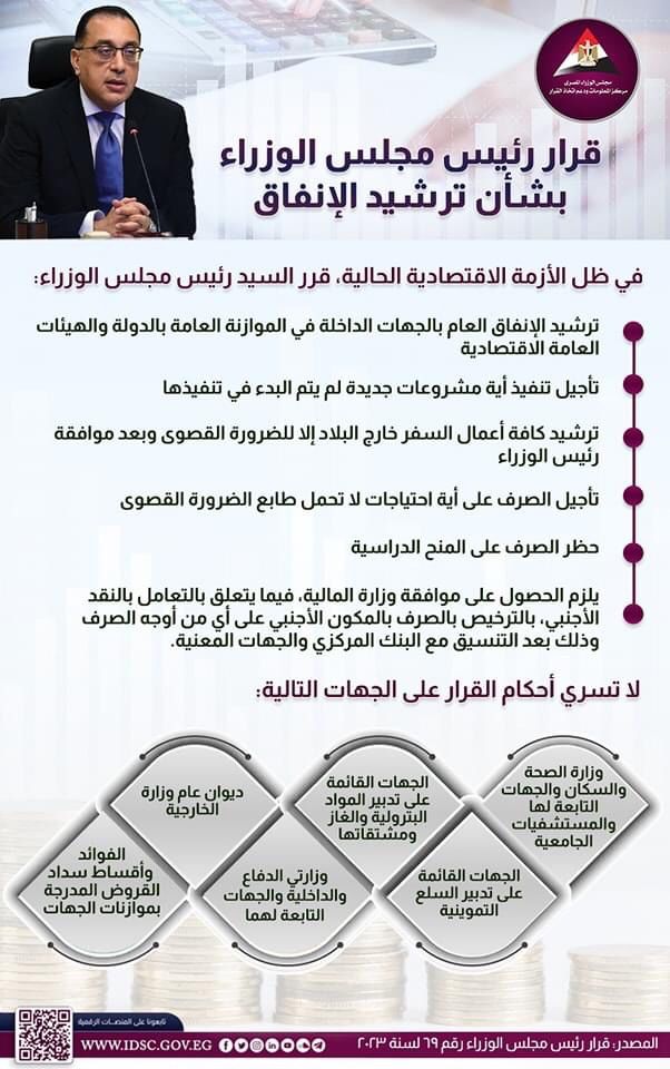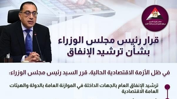نشرت مركز المعلومات ودعم اتخاذ القرار بمجلس الوزراء إنفوجراف عبر صفحته الرسمية على موقع التواصل الاجتماعي فيس بوك بشأن قرار رئيس الوزراء لترشيد الإنفاق .