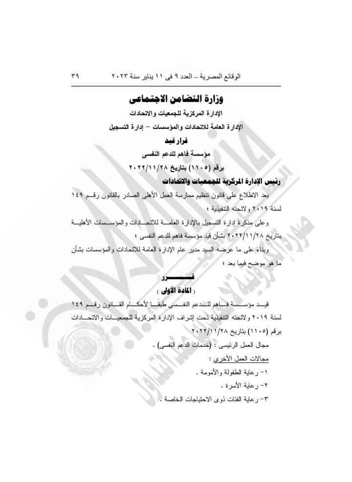 نشرت الجريدة الرسمية للدولة قرار وزارة التضامن الاجتماعى بقيد مؤسسة فاهم للدعم النفسي .