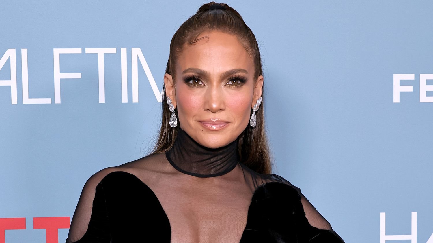 وظهرت جينفير لوبيز مرتدية بدلة وشيميز طويل باللون الأبيض، رافعة خصلات شعرها إلى أعلى، مع ميك أب ناعم على وجهها.