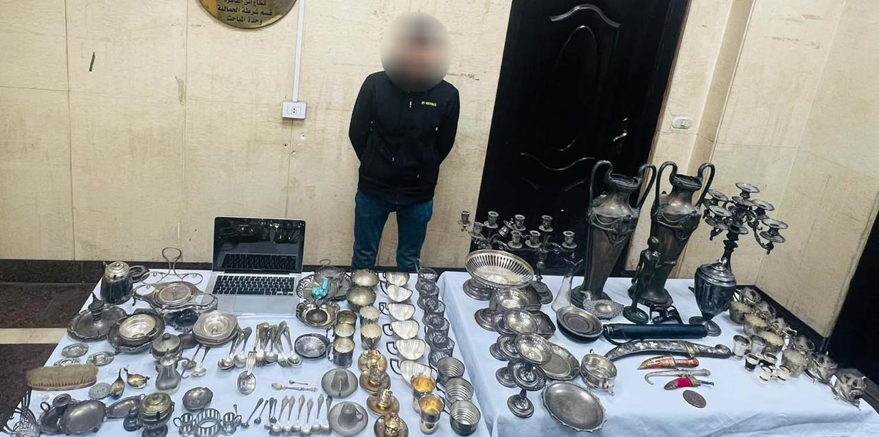 بالإنتقال أمكن ضبطه وتبين أنه فرد أمن سابق بإحدى شركة الأمن من الجيزة، وعُثر بحوزته على مجموعة من الفضيات والتحف والأنتيكات "مجهوليــــــن المصـــــدر".