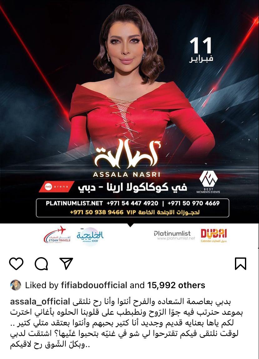 وكتبت أصالة :" بدبي بعاصمة السعادة والفرح أنتوا وأنا رح نلتقى بموعد حنرتب فيه جوا الروح ونطبطب على قلوبنا الحلوه بأغاني اخترت لكم ياها بعنايه قديم وجديد أنا كتير بحبهم وأنتوا بعتقد متلي كتير . لوقت نلتقى فيكم تقترحوا لي شو في غنيه بتحبوا غنيها؟ اشتقت لدبي ..وبكل الشوق رح لاقیکم".