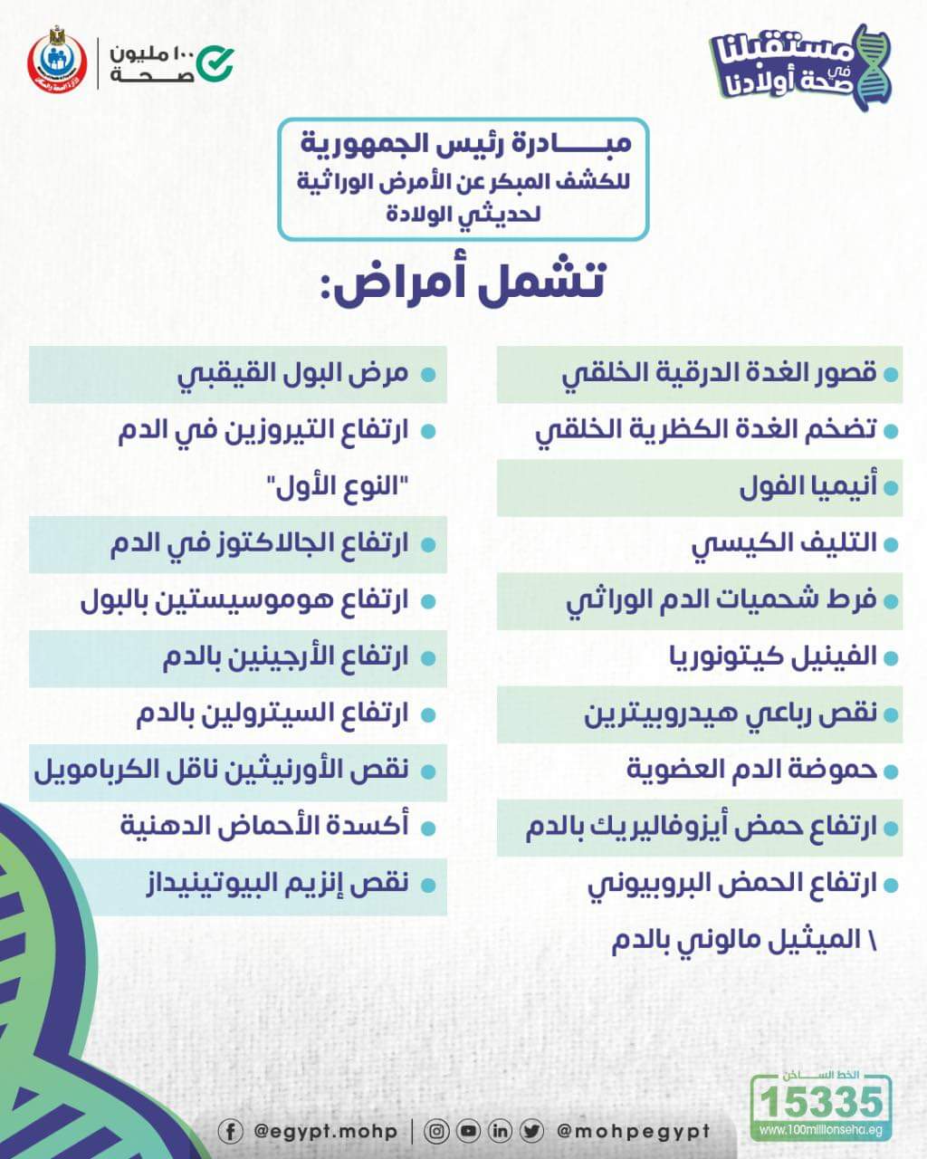 أكدت وزارة الصحة والسكان أن مبادرة رئيس الجمهورية للكشف المبكر عن الأمراض الوراثية لحديثي الولادة، الكشف عنهم وعلاجهم بالمجان.