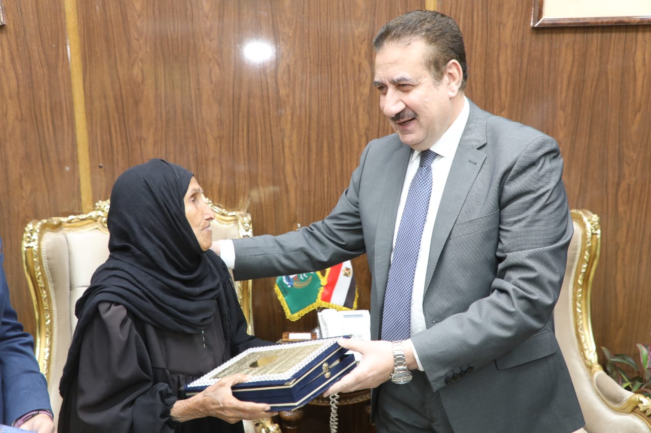 في لفتة طيبة كرم اللواء إبراهيم ابو ليمون محافظ المنوفية السيدة زبيدة عبد العال صاحبة ال٨٧ عاما والتي اجتازت امتحان محو الأمية وابنة قرية دكما في مركز شبين الكوم.