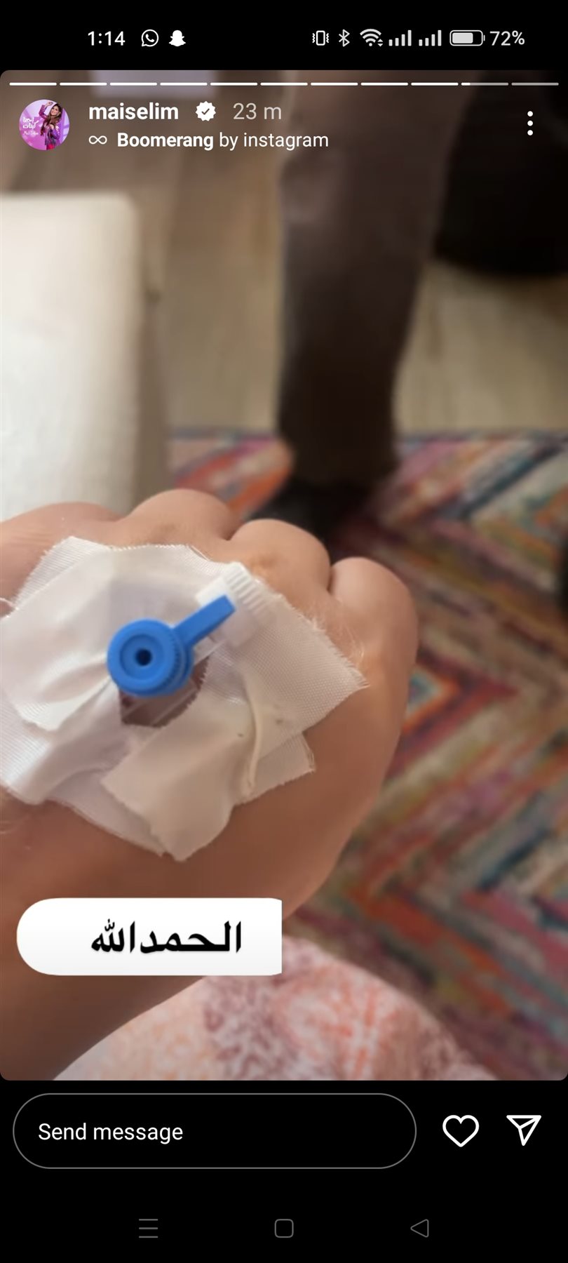ونشرت مي سليم صورة يديها، وكتبت" الحمدلله" عبر صفحتها الرسمية على موقع التواصل الاجتماعي لتبادل الصور والفيديوهات القصيرة إنستجرام خلال خاصية الاستوري.