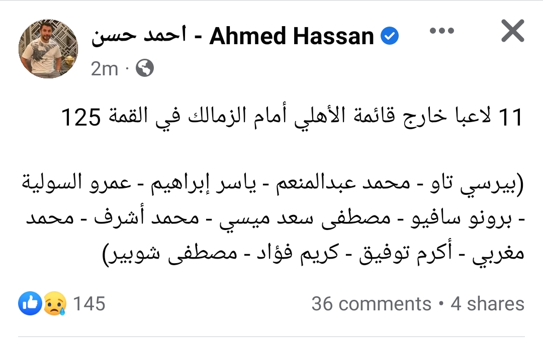 ونشر الصقر عبر صفحته الرسمية على “فيسبوك”: “11 لاعبا خارج قائمة الأهلي أمام الزمالك في القمة 125 وهم (بيرسي تاو - محمد عبد المنعم - ياسر إبراهيم - عمرو السولية - برونو سافيو - مصطفى سعد ميسي - محمد أشرف - محمد مغربي - أكرم توفيق - كريم فؤاد - مصطفى شوبير)”.