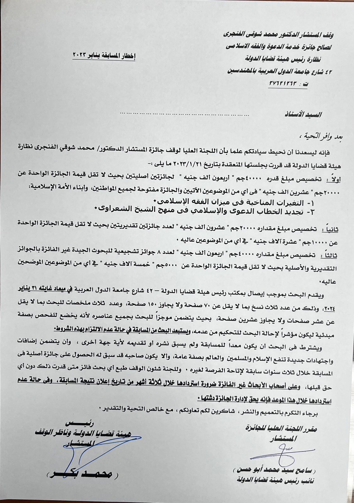 أكد المستشار سامح سيد محمد نائب رئيس الهيئة المتحدث الرسمي باسمها مقرر اللجنة العليا للوقف، أن اللجنة العليا للوقف قررت أن موضوعي المسابقة لعام ٢٠٢٣/٢٠٢٤ ستكون عن لموضوع الأول التغيرات المناخية في ميزان الفقه الإسلامي.