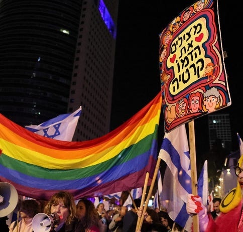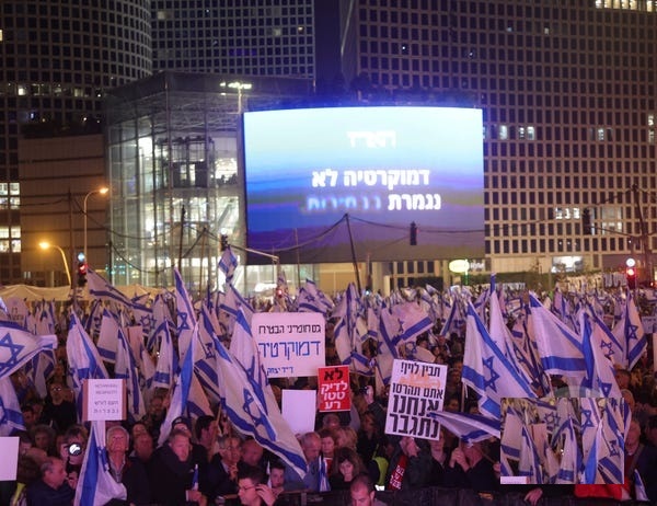 وقالت القناة 12 العبرية إنه للأسبوع الثاني على التوالي يواصل عشرات الآلاف التجمع في ساحة هبيما في تل أبيب وفي حيفا وفي بئر السبع في مظاهرات احتجاجية ضد ما يسمى الإصلاحات القضائية التي تنوى حكومة نتنياهو تنفيذها ضد المنظومة القضائية.