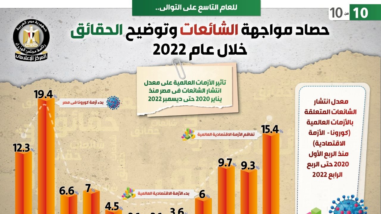 تعرضت الدولة المصرية للكثير من الشائعات خلال عام 2022، والتي سعت الحكومة بشكل سريع لكشفها، عبر إصدار المعلومات الحقيقية من الجهات الحكومية المختصة، ثم الرد عليها عبر المركز الإعلامي لمجلس الوزراء، فيما نشر مؤخرا تقريرا تضمن إنفوجرافات تتناول حصاد مواجهة الشائعات وتوضيح الحقائق خلال عام 2022.
