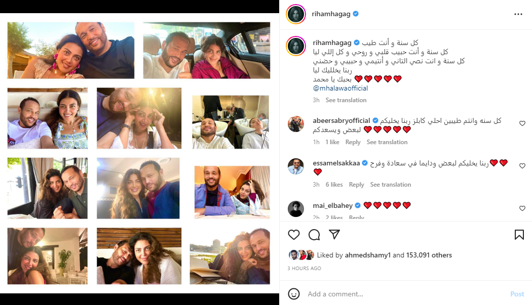 ونشرت ريهام حجاج صور مجمعة برفقه زوجها، وعلقت كاتبة: “كل سنة و أنت طيب كل سنة و أنت حبيب قلبي و روحي و كل اللي ليا كل سنة و انت نصي التاني و أنتيمي و حبيبي و حضني ربنا يخلليك ليا بحبك يا محمد”.