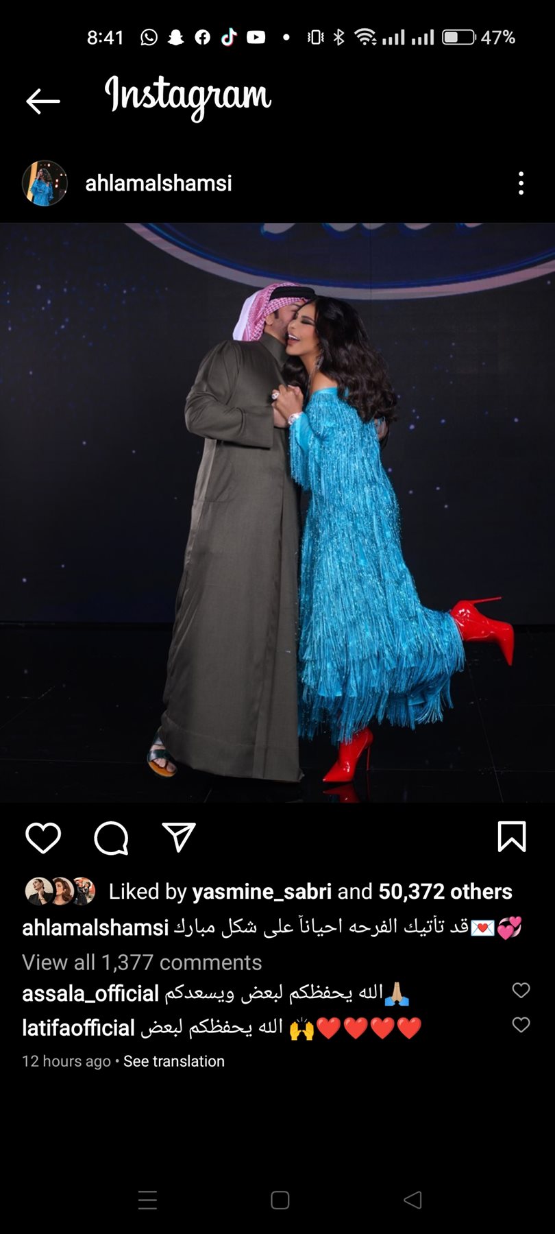 وظهرت أحلام في الصورة رفقة زوجها، وكتبت:"قد تأتيك الفرحة أحياناً علي شكل مبارك"