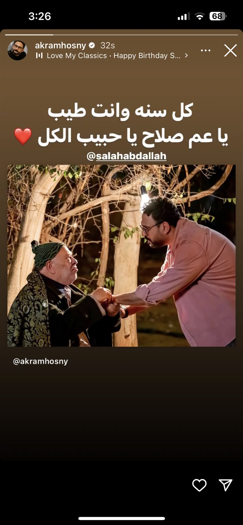احتفل الفنان أكرم حسني، بعيد ميلاد الفنان صلاح عبد الله، عبر حسابه الشخصي على موقع التواصل الاجتماعي انستجرام.