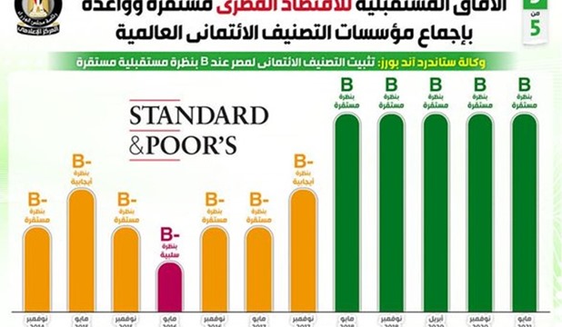 كما يدل التصنيف الإئتماني لمؤسسة ستاندرد آند بورز، على قدرة مصر على احتواء الأزمة الاقتصادية ومواجهتها، فيما يشير تصنيف B إلى وجود مخاطر، إلا أن النظرة المستقبلية مستقرة نظرا لقدرة الدولة على مواجهة هذه المخاطر آخذا في الاعتبار معدلات النمو وفقا للناتج المحلي.