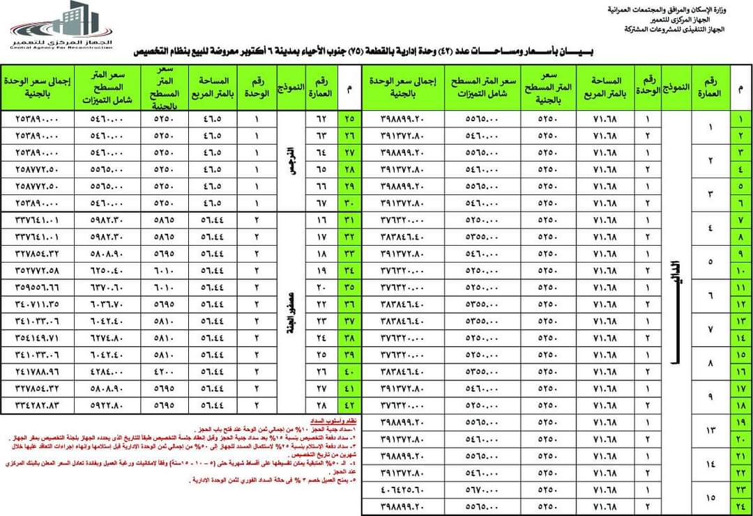ويسدد المنتفع 10% من ثمن الوحدة جدية حجز، و15% دفعة تخصيص، ويتم سداد 25% بعد ذلك لاستكمال المسدد إلى 50% خلال شهرين من التخصيص