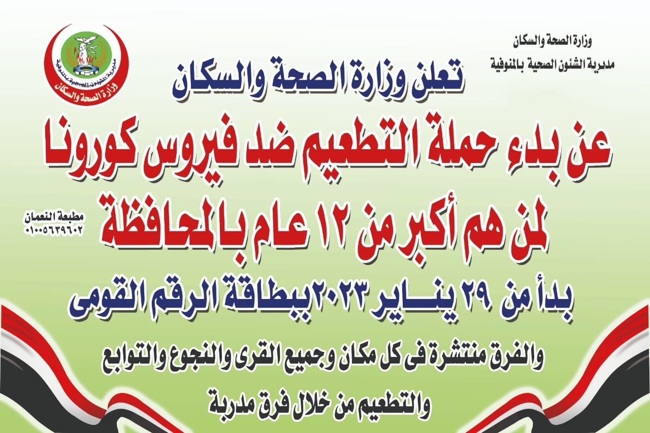 يأتى هذا تزامنا مع انطلاق حملة " طرق الأبواب " للتطعيم ضد الفيروس بمختلف مراكز ومدن وقرى المحافظة بدءاً من اليوم الأحد 29 يناير الجارى ولمدة أسبوعين بهدف الحفاظ على الصحة العامة ورفع المناعة المجتمعية .