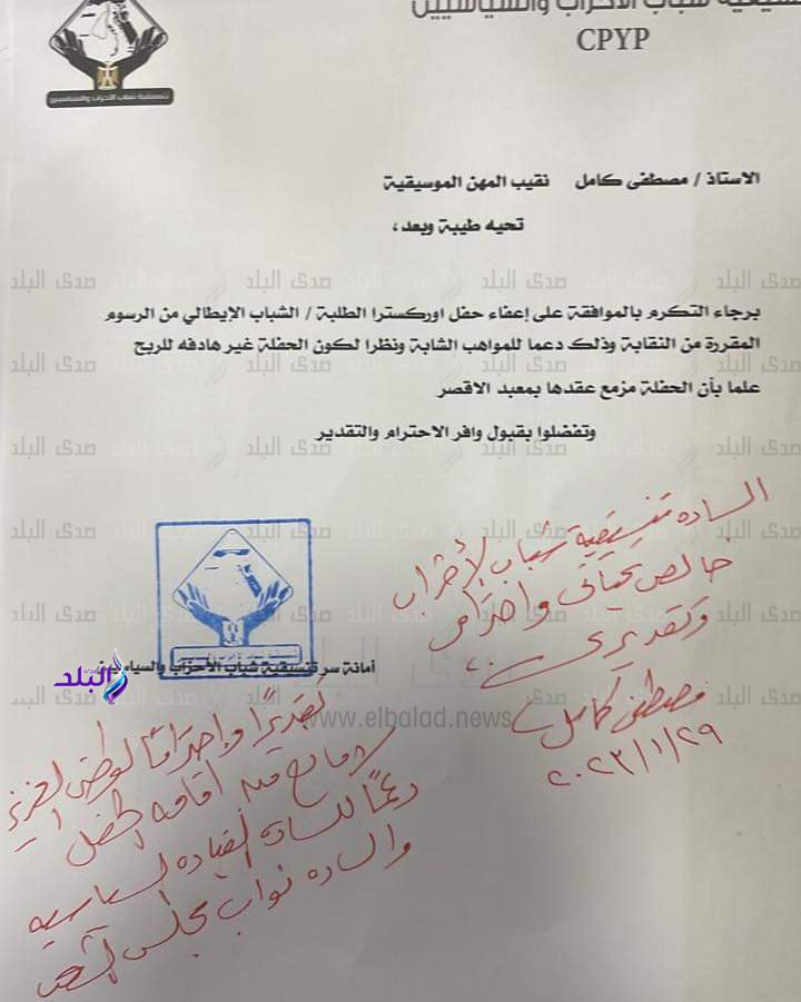 جاء ذلك بعد تدخل تنسيقية شباب الأحزاب والسياسيين لحل الأزمة مع نقابة الموسيقيين، وإمضاء النقيب مصطفى كامل على الطلب.