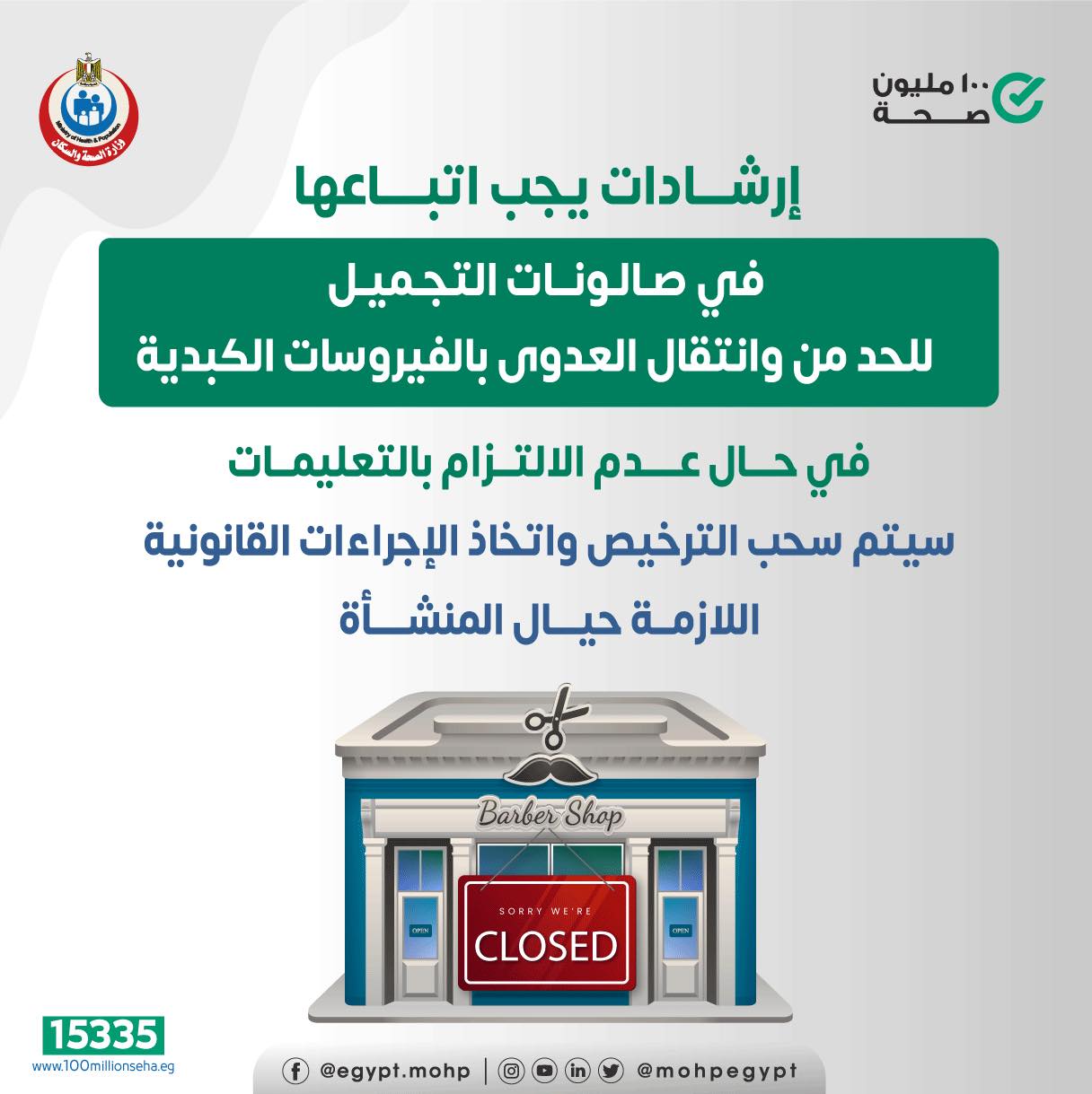 وشددت وزارة الصحة والسكان ، علي انه حال عدم الإلتزام بتلك التعليمات يتم سحب الترخيص من صالون التجميل “ محل الحلاقة ” .