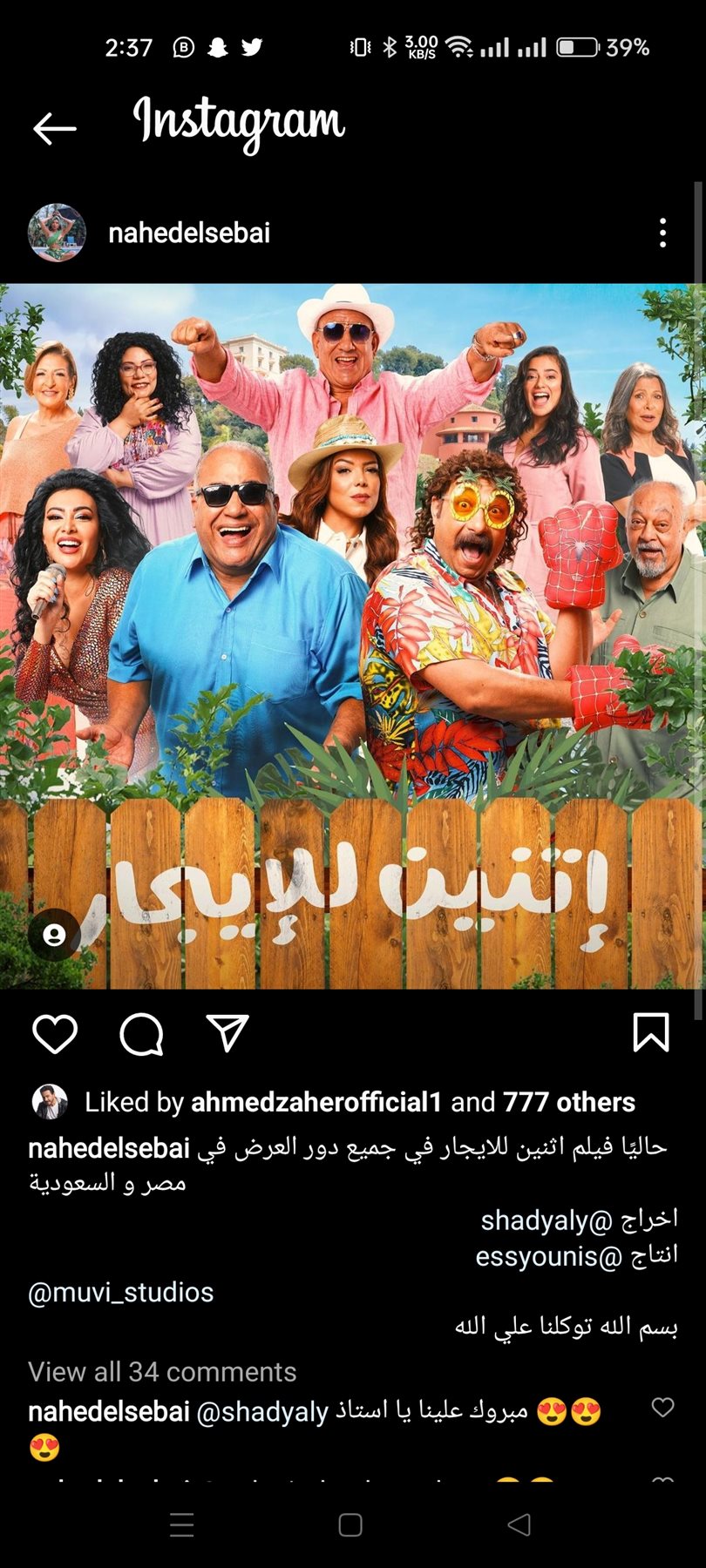 روجت الفنانة ناهد السباعي لـ فيلمها الجديد "اتنين للإيجار" وذلك عبر صفحتها الرسمية على موقع التواصل الاجتماعي لتبادل الصور والفيديوهات القصيرة إنستجرام.