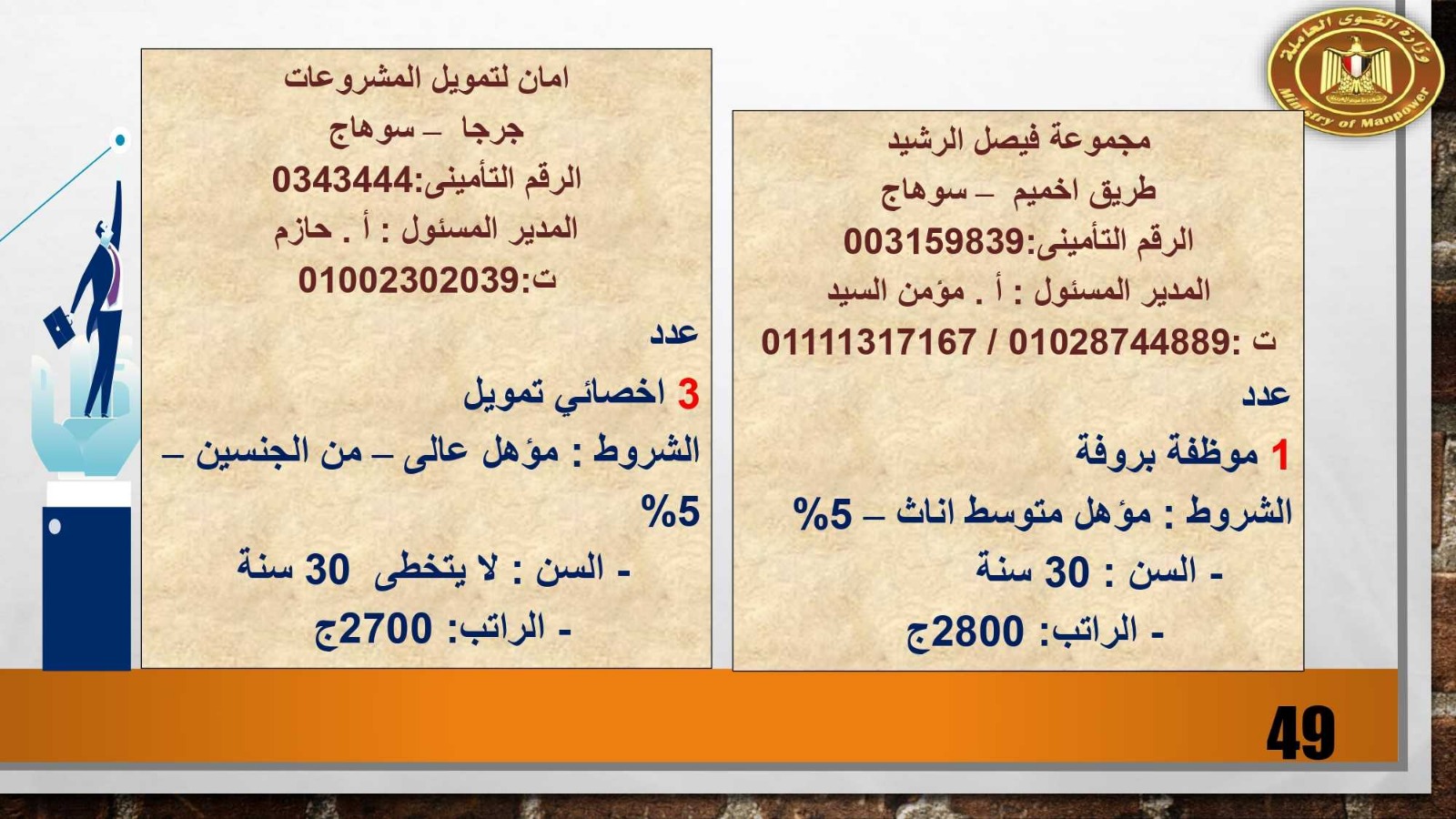 وقالت الوزارة ، اليوم الأربعاء" : إن هذه الفرص تم توفيرها من خلال نشرة التوظيف الدورية التي تصدر عن الوزارة كل 15 يوما ،من خلال الإدارة العامة للتشغيل برئاسة هبه أحمد مدير عام التشغيل بالوزارة، وتعدها منى شوقي باحث أول بالإدارة، مشيرة إلي أن هذه الفرص متوفرة في محافظات القاهرة ، والجيزة ، وبورسعيد ، وأسيوط ، والإسكندرية ، والغربية، والمنوفية ،والقليوبية ،والشرقية، والإسماعيلية ، وسوهاج ، والدقهلية ، والوادي الجديد.