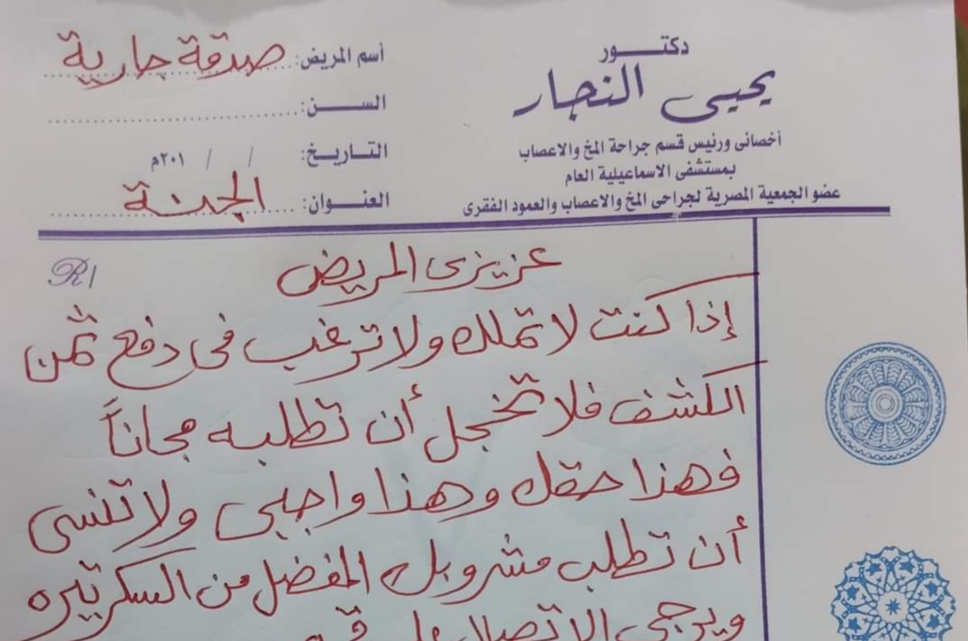 وكتب الطبيب: “عزيزي المريض إذا كنت لا تملك ولا ترغب في دفع ثمن الكشف، فلا تخجل أن تطلبه مجانا، فهذا حقك وهذا واجبي”.