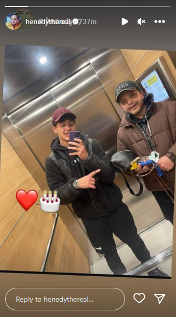 وظهر محمد هنيدي عبر خاصية “الاستوري”، في صورة سيلفي أمام المرآة برفقه ابنه، وعلق هنيدي علي الصورة واضعًا شكل القلب مع شكل تورتة عيد ميلاد.
