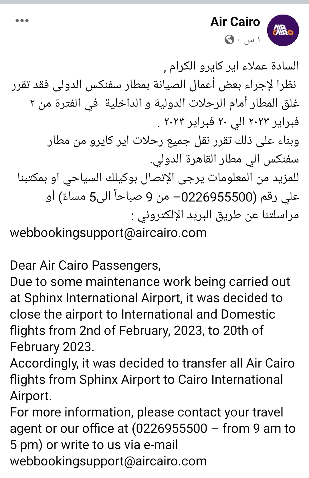 وقالت شركة إيركايرو، إنه نظرًا لإجراء بعض أعمال الصيانة بمطار سفنكس الدولي، فقد تقرر غلق المطار أمام الرحلات الدولية والداخلية في الفترة من 2 فبراير 2023 إلى 20 فبراير 2023.