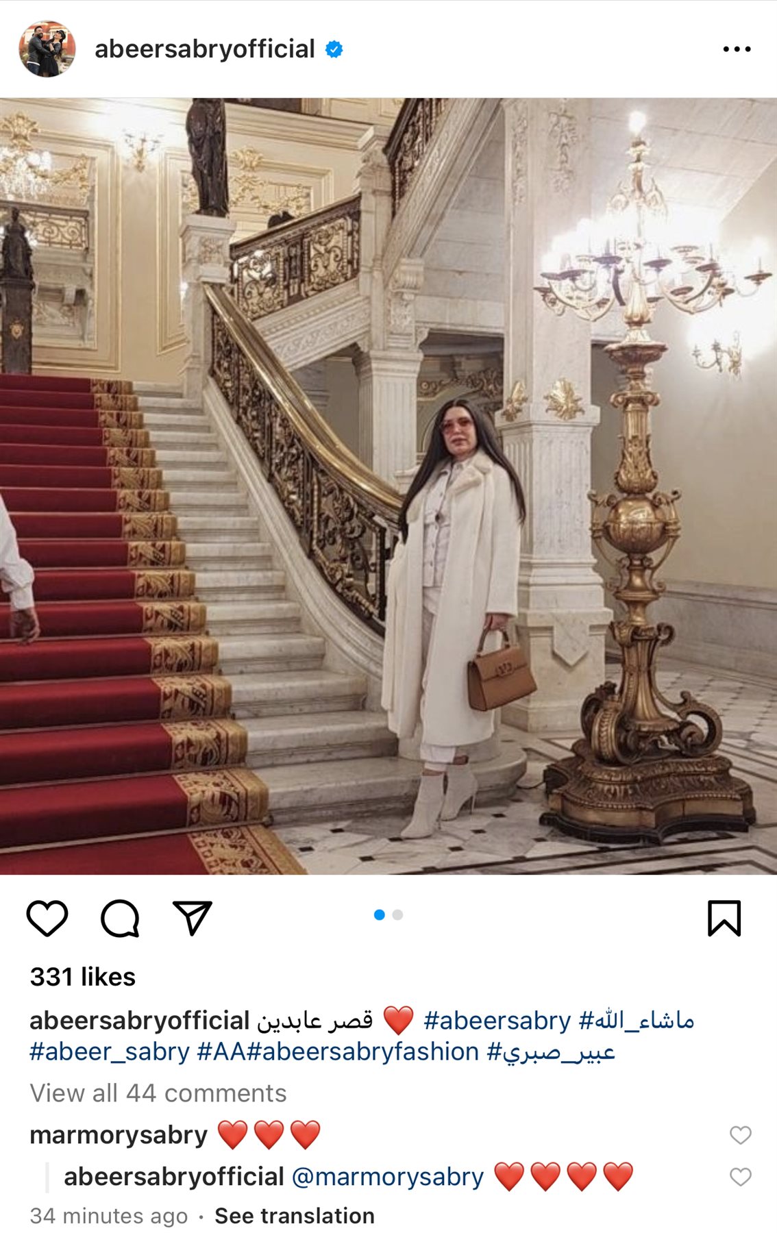 وظهرت عبير صبري من داخل قصر عابدين، وهي ترتدي طقم شتوي أنيق باللون الأبيض، ونالت الصور إعجاب المتابعين.