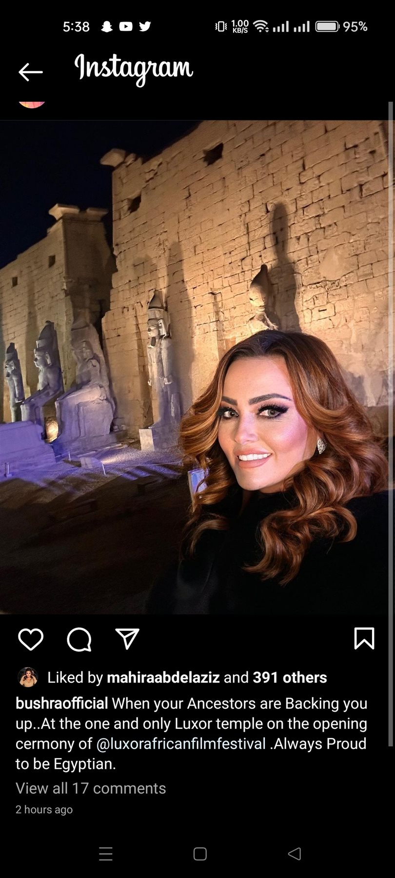 وظهرت بشري في الصور من داخل معبد الأقصر، بإطلالة شتوية متميزة مرتدية بالطو ومعتمدة على المكيب البارز الذي أبرز ملامحها.