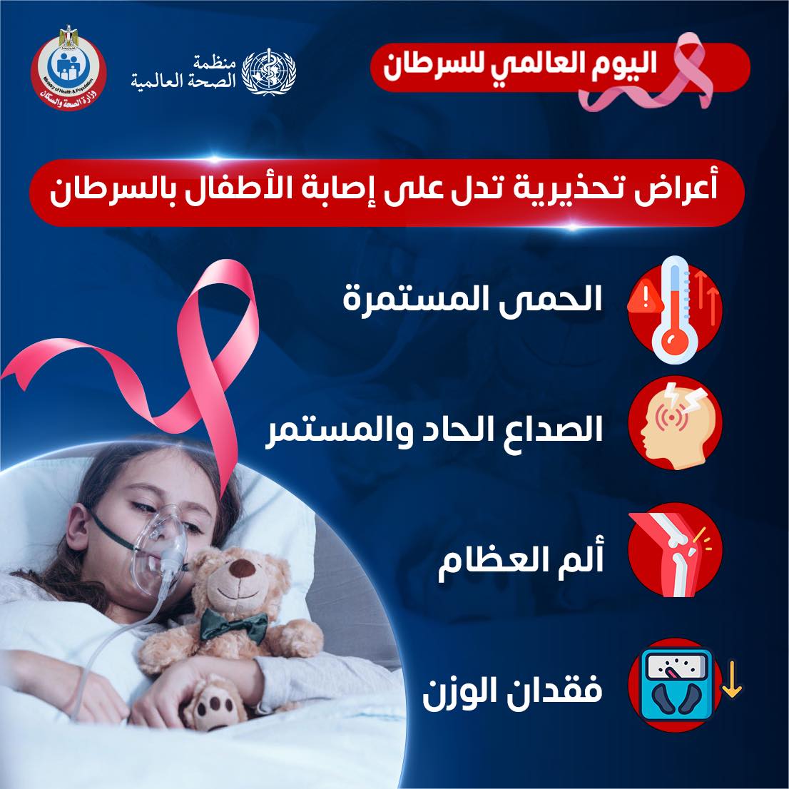 نشرت وزارة الصحة والسكان ، معلومات هامة عن أعراض تحذيرية تدل على إصابة الأطفال بالسرطان ، وذلك تزامنا مع الاحتفال باليوم العالمي للسرطان