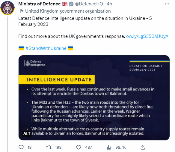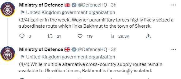 وتابعت في بيانها: “استولت قوات “فاجنر”، شبه العسكرية، على طريق تابع يربط باخموت ببلدة سيفرسك”، مؤكدة أن "باخموت تزداد عزلة".