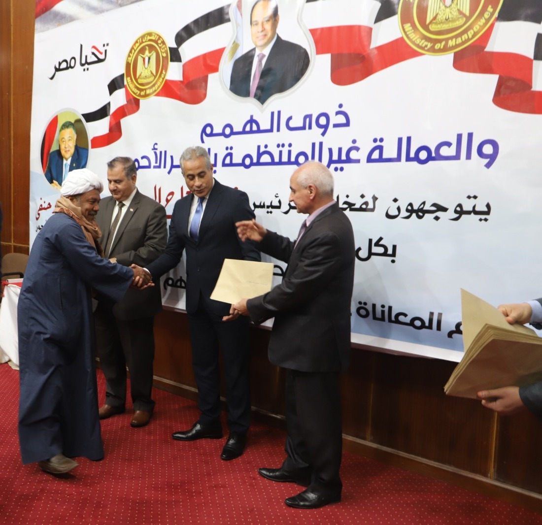 سلم وزير القوى العاملة حسن شحاتة، اليوم الأحد، 15 بوليصة تأمين ضد الحوادث الشخصية للعمالة غير المنتظمة من إجمالى 30 بوليصة ، وذلك فى إطار المبادرة الرئاسية حياة كريمة، وتنفيذاً لتوجيهات القيادة السياسية برئاسة الرئيس عبدالفتاح السيسي رئيس الجمهورية، بالاهتمام بالعمالة غير المنتظمة ورعايتها إجتماعياً وصحياً ، وفى إطار جهود وزارة القوى العاملة لتقديم الدعم لتلك الفئة وحمايتها من أخطار المهن التى يعملون بها ، ورعايتها إجتماعياً وصحياً وتأمينياً من خلال إدارات مختصة فى كل مديرية من مديريات القوى العاملة بالمحافظات وتحت اشراف الإدارة المركزية لرعاية العمالة غير المنتظمة بالوزارة والوحدة المركزية التى تم تشكيلها مؤخراً لرعاية شؤون تلك الفئة.