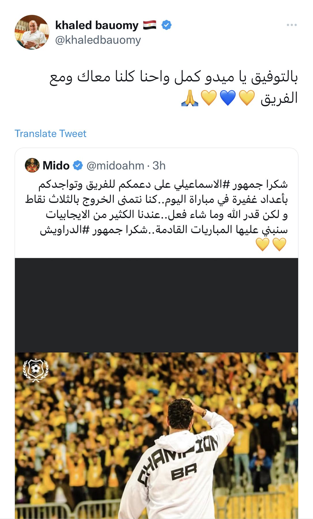 وكتب خالد بيومي عبر حسابه الشخصي بموقع التواصل الاجتماعي “تويتر”: “بالتوفيق يا ميدو كمل واحنا كلنا معاك ومع الفريق”.