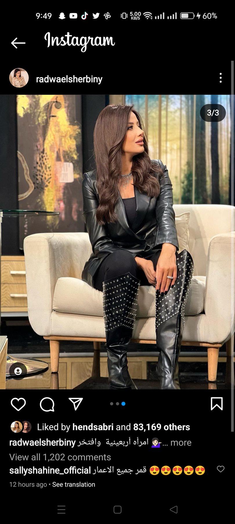 وظهرت رضوي في الصور بلوك شتوي جديد، مرتدية فستان جلد أسود وحذاء طويل الرقبة، ومعتمدة علي المكيب الهادي وإنسدال خصلات شعرها السوداء علي كتفيها.