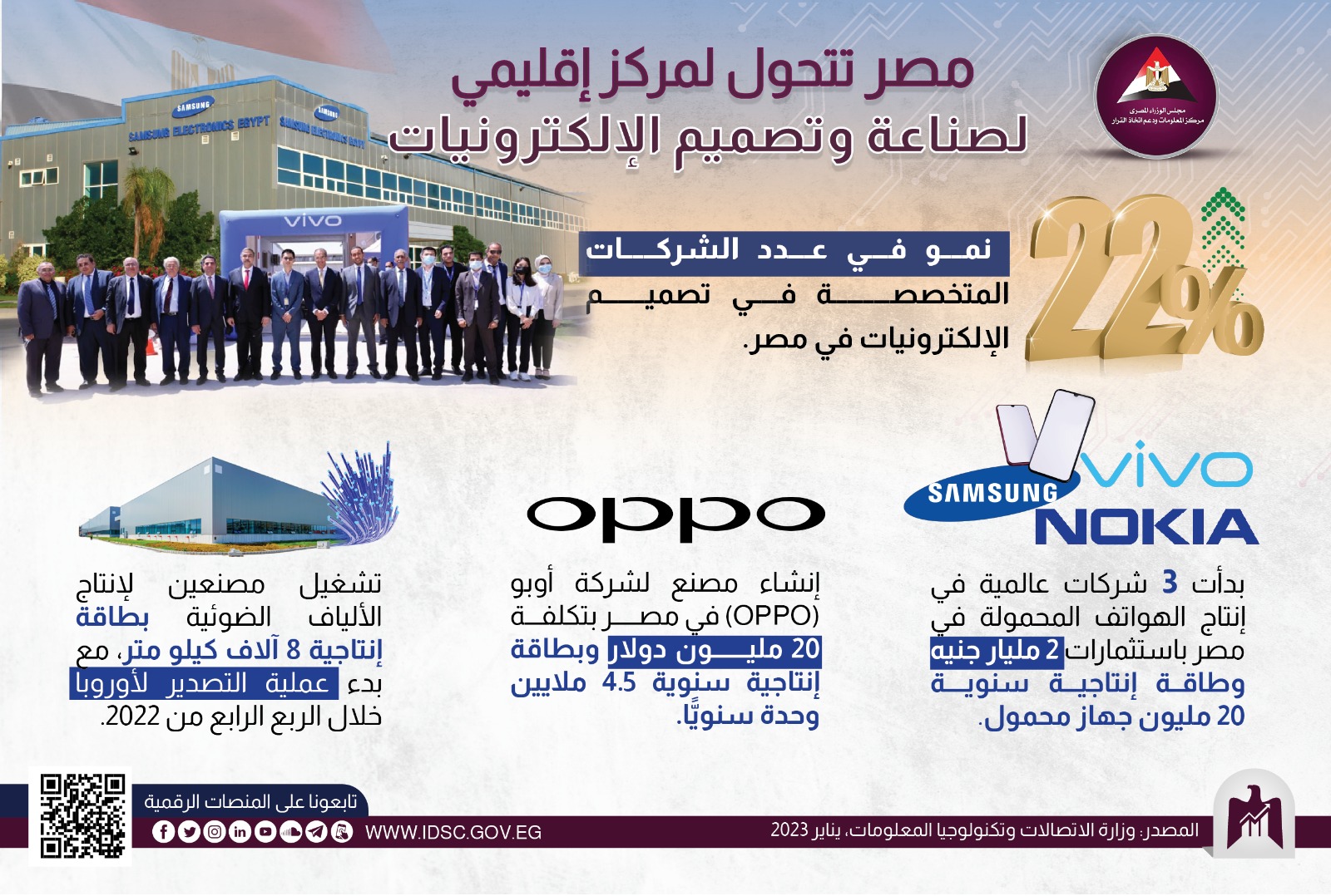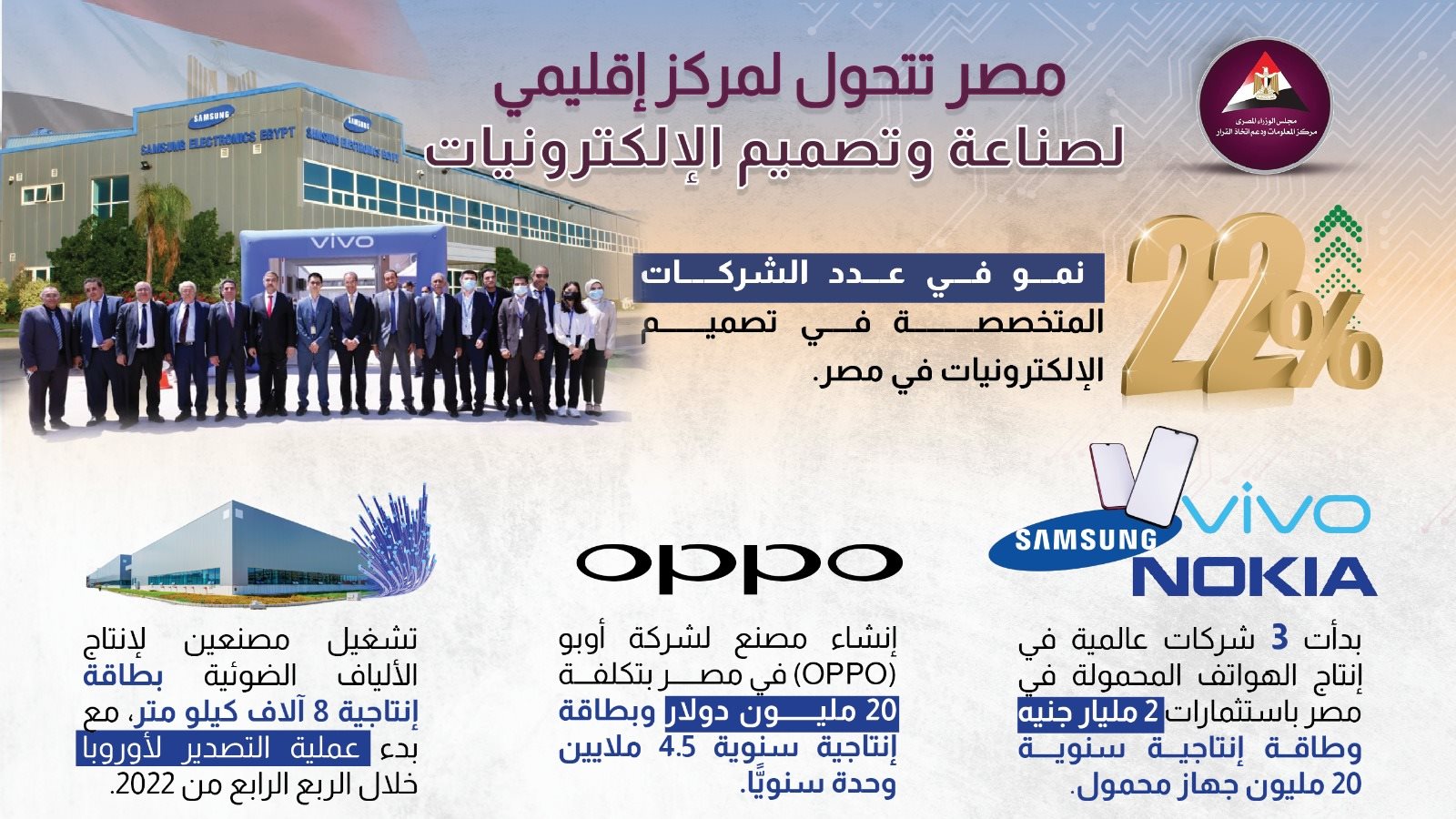 نشر مركز المعلومات ودعم اتخاذ القرار بمجلس الوزراء، انفوجراف عبر صفحته الرسمية على موقع التواصل الاجتماعي فيس بوك ، يتناول صناعة الإلكترونيات في مصر؛ حيث بدأت 3 شركات عالمية وهي شركة فيفو لتصنيع الهواتف الذكية وشركة نوكيا العالمية، وشركة سامسونج في إنتاج الهواتف المحمولة في مصر باستثمارات 2 مليار جنيه وطاقة إنتاجية سنوية 20 مليون جهاز محمول.