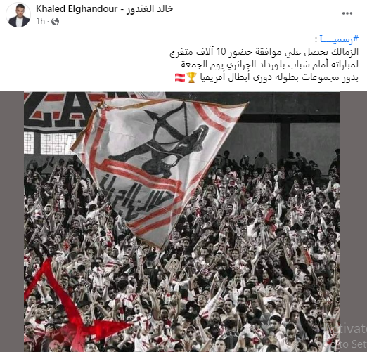 وكتب خالد الغندور في منشور له، عبر حسابه الشخصي بموقع التواصل الاجتماعي “فيسبوك”: “الزمالك يحصل علي موافقة بحضور 10 آلاف متفرج لمباراته أمام شباب بلوزداد الجزائري يوم الجمعة بدور مجموعات بطولة دوري أبطال أفريقيا”.