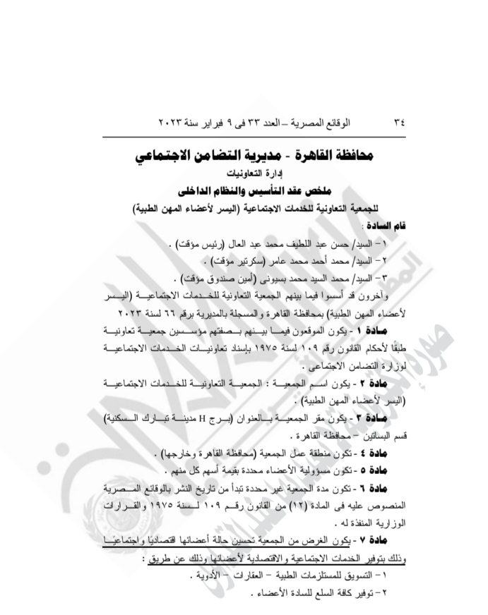 وآخرون قد أسسوا فيما بينهم الجمعية التعاونية للخـدمات الاجتماعيـة (اليـسر لأعضاء المهن الطبية) بمحافظة القاهرة والمسجلة بالمديرية برقم 66 لسنة ٢٠٢٣ مادة 1 - يكون الموقعون فيمـا بيـنـهـم بـصفتهم مؤسـسين جمعيـة تعاونيـة