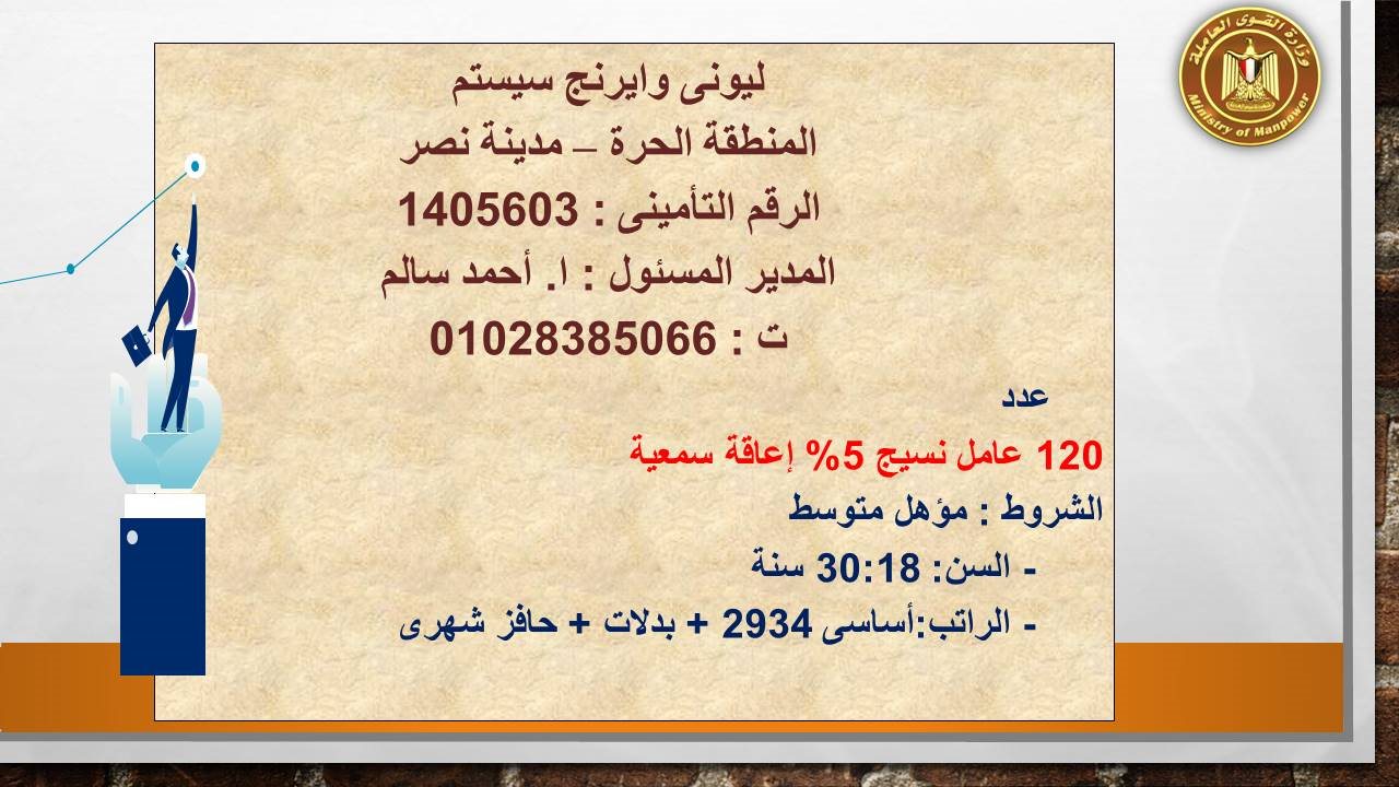 وفرت وزارة القوى العاملة، 120 فرصة عمل لذوى الهمم لأصحاب الإعاقة السمعية، من حملة المؤهلات المتوسطة؛ للعمل على مهنة عامل نسيج، وذلك بالتعاون مع شركة "ليونى وايرنج سيستم" بالمنطقة الحرة بمدينة نصر بالقاهرة.
