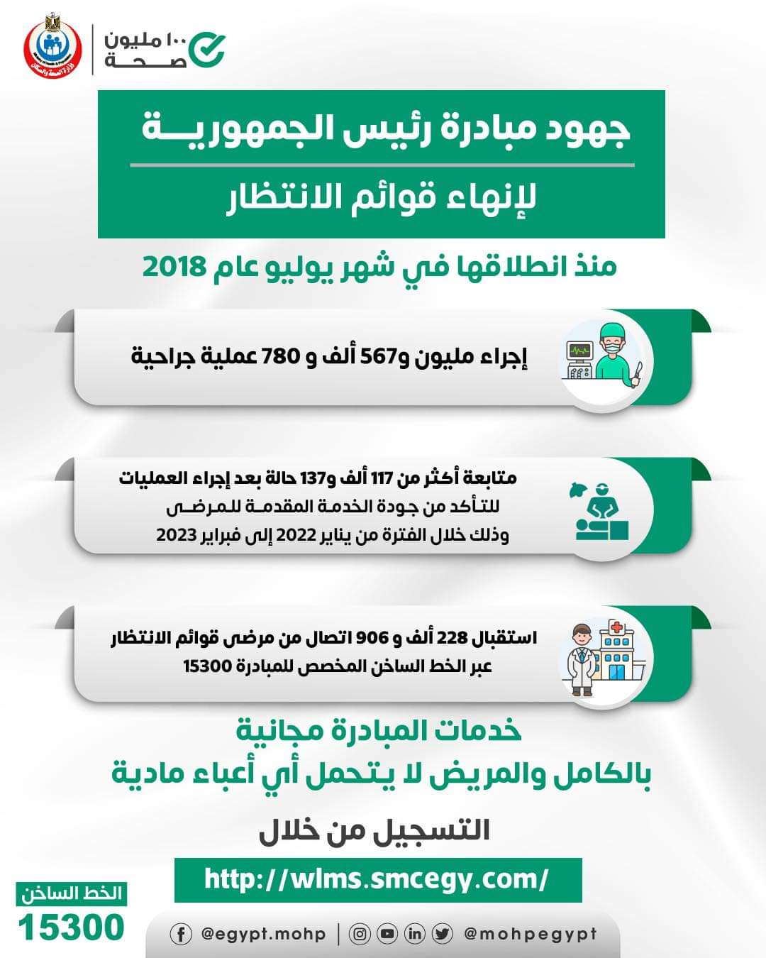 نشرت وزارة الصحة والسكان انفوحراف عن جهود مبادرة رئيس الجمهورية لإنهاء قوائم الانتظار، منذ انطلاقها في شهر يوليو عام 2018