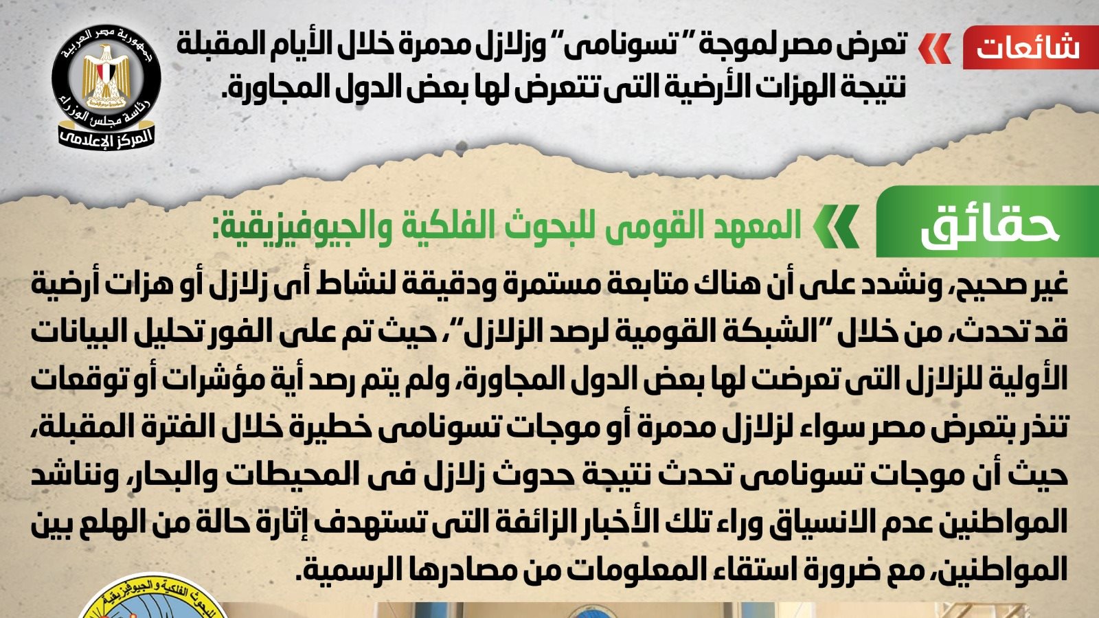 وقد قام المركز الإعلامي لمجلس الوزراء بالتواصل مع المعهد القومي للبحوث الفلكية والجيوفيزيقية، والذي نفى تلك الأنباء، مُؤكداً أنه لا صحة لتعرض مصر لموجة "تسونامي" وزلازل مدمرة خلال الأيام المقبلة نتيجة الهزات الأرضية التي تتعرض لها بعض الدول المجاورة، مُشدداً على أن هناك متابعة مستمرة ودقيقة لنشاط أي زلازل أو هزات أرضية قد تحدث، من خلال "الشبكة القومية لرصد الزلازل"، حيث تم على الفور تحليل البيانات الأولية للزلازل التي تعرضت لها بعض الدول المجاورة، ولم يتم رصد أية مؤشرات أو توقعات تنذر بتعرض مصر سواء لزلازل مدمرة أو موجات تسونامي خطيرة خلال الفترة المقبلة، حيث أن موجات تسونامي تحدث نتيجة حدوث زلازل في المحيطات والبحار، مُناشداً المواطنين عدم الانسياق وراء تلك الأخبار الزائفة التي تستهدف إثارة حالة من الهلع بين المواطنين، مع ضرورة استقاء المعلومات من مصادرها الرسمية.